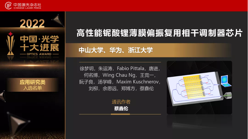 2022年度中国光学十大进展发布,杏吧视频 蔡鑫伦教授团队研究成果“世界首例铌酸锂薄膜偏振复用相干光调制器”成功入选“2022中国光学十大进展”(应用研究类),这是该团队继2019年和2020年后第三次获此殊荣。获奖研究成果于2022年1月以“Dual-polarization Thin-film Lithium Niobate IQ modulator for Terabit-per-second Transmission”为题发表在光学顶尖国际期刊Optica上。该项研究成功研制出了在下一代超高速、低功耗的相干光传输系统不可或缺的电光转换器件。博士研究生徐梦玥和博士后朱运涛为该论文的共同第一作者。