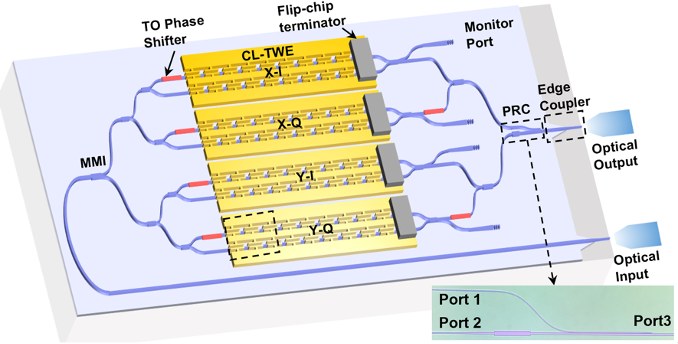 在5G、物联网、虚拟现实、人工智能等新一代信息技术推动下,通信网络信息容量继续呈指数增长,光通信技术面临如何进一步拓宽带宽和降低能耗的巨大挑战。电光调制器是把电子信号加载至光载波上的关键功能器件,也是电光调制器芯片是光通信系统中容量、能耗和集成度矛盾最突出的瓶颈性器件。支持偏振复用的同向正交(Dual-polarization In-phase Quadrature, DP-IQ)调制器的作用是将数字电信号以传输效率更高的高阶幅度相位调制格式加载到两个偏振态相互正交的光载波上,是相干光通信系统发射端的核心关键器件,也是复杂程度最高的电光调制器。长久以来,世界各国都在致力于实现小型化、超大带宽(>100 GHz)、超低驱动电压(~1V)和高线性度的DP-IQ调制器。与传统的铌酸锂晶体材料相比较,铌酸锂薄膜在继承其固有的线性电光效应强和本征光损耗低等优点的同时,可以构建具有较高折射率差的光波导,通过压缩光波模式的横截面积大幅度降低调制电压和功耗,并且可以大大缩小光子器件尺寸,因此非常有利于实现规模化集成的小尺寸、高性能光电子芯片。近年来,蔡鑫伦教授团队基于铌酸锂薄膜的光电子器件研究取得了一系列的重要进展,开发出一大批性能优越的光电子功能芯片,然而支持超高速率光传输的铌酸锂薄膜DP-IQ调制器却却一直未能成功研制。