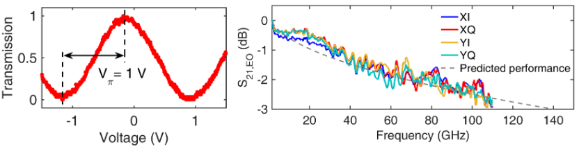 获奖研究工作实现了世界首例基于铌酸锂薄膜的偏振复用相干光调制器芯片(图2)。该芯片集成了四个马赫曾德尔型调制器(MZM)和低串扰、低插入损耗的偏振旋转合束器(PRC)。电压-带宽积是衡量调制器性能的关键指标,该工作突破性地实现了目前调制器的最高水平(>100 GHz/V2)。芯片创新地采用了优化设计的电容加载行波电极 (capacitance-loaded traveling-wave electrodes,CL-TWE),相比传统电极,具有更低的微波损耗以及更完美的电光匹配,实测电光调制器带宽超过110 GHz(图3),已达到实验室微波测试设备的测量极限,这也是世界首例带宽超过100 GHz的DP-IQ电光调制器。