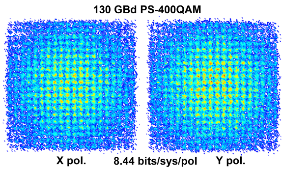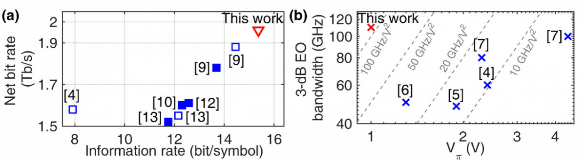 芯片中的四路MZM都具有低至1V的半波电压,调制驱动电压仅仅需要600 mV左右,可以由普通的低功耗CMOS芯片直接驱动,这一特性将在未来低功耗、低成本的光通信链路中发挥重要作用。利用该器件,研究团队展示了130 Gbaud的概率星座图整形400 QAM(图4)。器件在CMOS兼容的驱动电压下,实现了单载波1.96 Tb/s的传输速率,这是目前单载波相干传输净比特速率的世界纪录(图5),每比特的电功耗仅有1.04 fJ/bit。