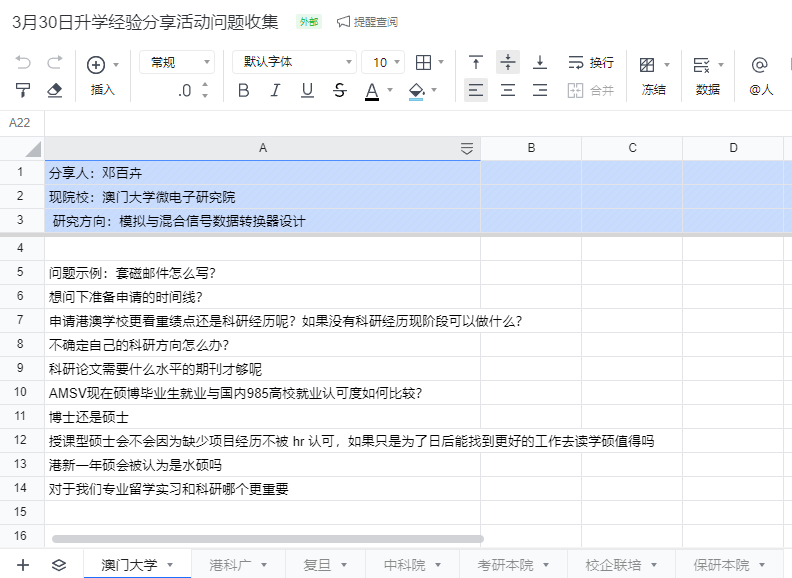 为深入了解群众需求并有针对性地开展工作,活动开始前一周,支部同志为本科同学提供了分享人的院校、研究方向等信息,并通过共享文档的形式向本科生同学收集了感兴趣的问题和对升学深造方面的疑惑。这些问题在宣讲会前反馈给分享人,使其做出更有针对性的分享与指导。