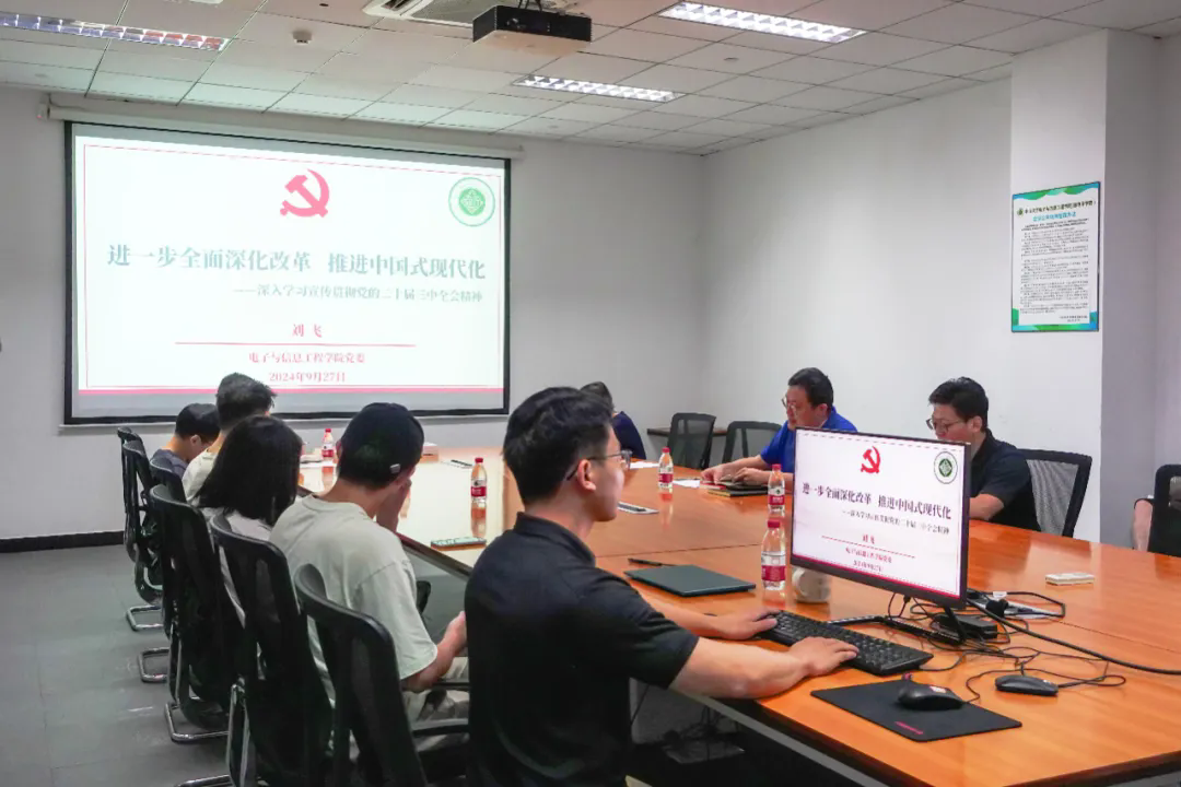 首先,刘飞书记带领各支部书记集中学习党的二十届三中全会精神。这次全会是在以中国式现代化全面推进强国建设、民族复兴伟业的关键时期举行的一次十分重要的会议。全会审议通过的《中共中央关于进一步全面深化改革 推进中国式现代化的决定》深刻阐述了进一步全面深化改革、推进中国式现代化的重大意义和总体要求,是指导新征程上进一步全面深化改革的纲领性文件。学习好贯彻好党的二十届三中全会精神,是当前和今后一个时期全党全国的一项重大政治任务。刘飞书记强调,杏吧视频 要上下联动、共同推进,按照学校党委统一部署及工作要求,将贯彻落实党的二十届三中全会精神与教育教学、管理服务等深度融合。希望各支部联系专业实际,通过“三会一课”等形式深入开展党的二十届三中全会精神的学习。