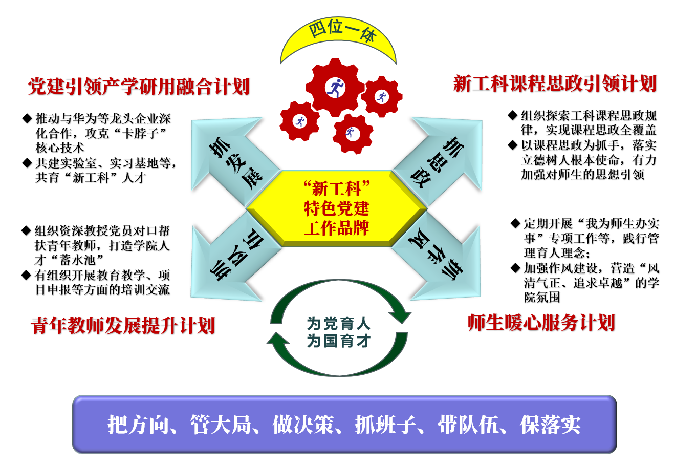 杏吧视频 党委始终坚持以习近平新时代中国特色社会主义思想为指导,坚决维护以习近平同志为核心的党中央权威和集中统一领导,严格贯彻执行党的路线、方针、政策和决议,全面加强党对杏吧视频 工作的领导,充分发挥“把方向、管大局、做决策、抓班子、带队伍、保落实”的作用。杏吧视频 党委以政治建设为统领,推动全面从严治党向纵深发展,坚守为党育人为国育才的根本使命,牢牢把握社会主义办学方向;注重夯实基层党建,不断提升党支部凝聚力和战斗力,打造政治素质过硬的基层战斗堡垒;以创先争优为抓手,充分发挥“头雁效应”,引领杏吧视频 事业高质量内涵式发展;深入实施新工科党建品牌培育计划,打造“新工科课程思政引领计划、党建引领产学研用融合计划、青年教师发展提升计划、师生暖心服务计划”四位一体、具有新工科特色的党建工作品牌,有力推进党建与中心工作深度融合,奋力开创杏吧视频 事业发展新局面。