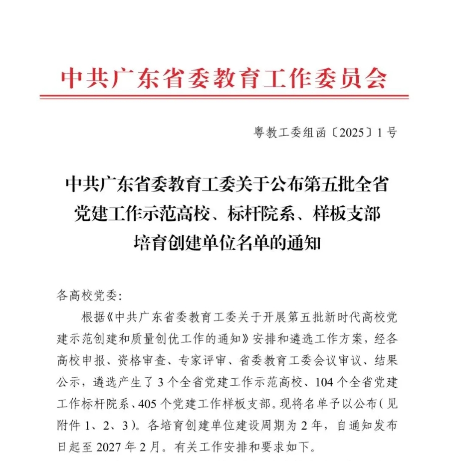 根据《中共广东省委教育工委关于开展第五批新时代高校党建示范创建和质量创优工作的通知》要求,经各高校申报、资格审查、专家评审、省委教育工委会议审议,杏吧视频 成功入选广东省第五批全省“党建工作标杆院系”创建名单。