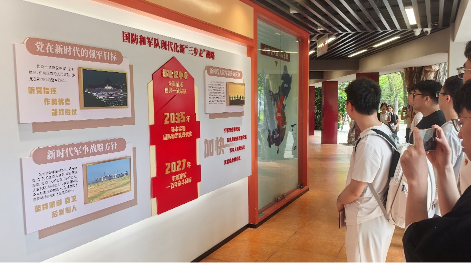 参观人员认真阅览国防教育长廊国防和军队现代化新“三步走”战略内容