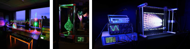 左图是本研究小组研制的锁相放大器在美国硅谷被应用于虚拟现实增强技术;中图与右图是锁相放大器在加拿大多伦多大学被应用于超声波介质检测,右图左下角是本研究小组研制的锁相放大器。