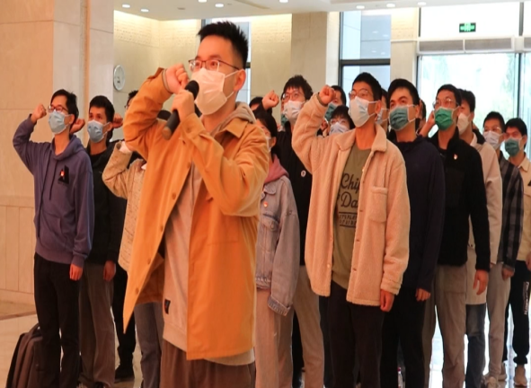 中国共产党人的初心和使命,就是为中国人民谋幸福,为中华民族谋复兴。在教育基地大厅,红色大屏上的入党誓词耀眼醒目。在党支部书记彭琢雅的领誓下,全体党员庄严地重温入党誓词。党员同志们正衣冠、佩党徽、紧握拳,通过铿锵有力的声音,表达了坚守初心使命的意志和决心,同志们的铮铮誓言在教育基地久久回响。
