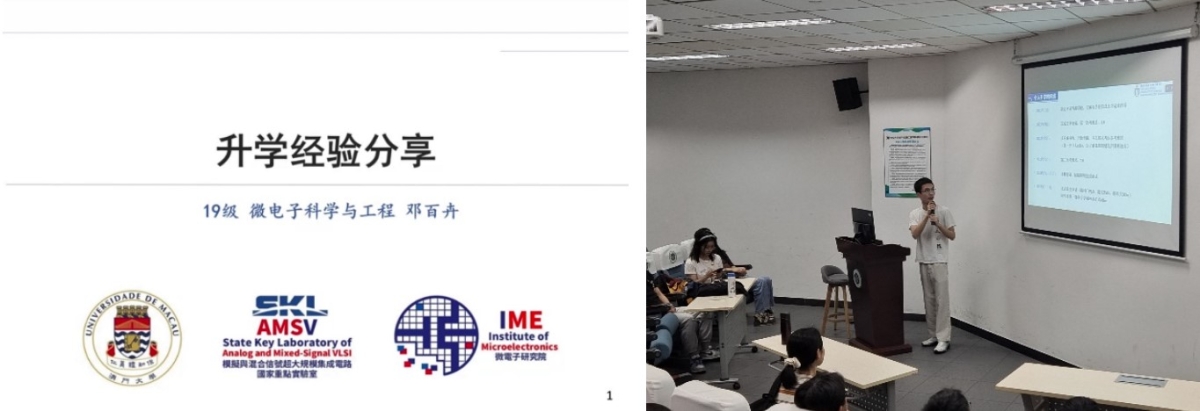 首先进行的是来自澳门大学的邓百卉同志的线上分享。邓百卉同志是杏吧视频 19级微电子科学与工程专业的同学,毕业后在澳门大学微电子研究院继续深造。邓百卉同志为大家介绍了澳门大学微电子研究院的基本情况,并分享了自己在升学申请过程当中的经验和注意事项。此外,来自香港科技大学(广州)的陈培宇同志就个人升学时间线为本科同学展示了自己的申请过程,向大家分享了如何去确立目标和做出准备,并提醒大家要多了解学校和课题组的详细信息。