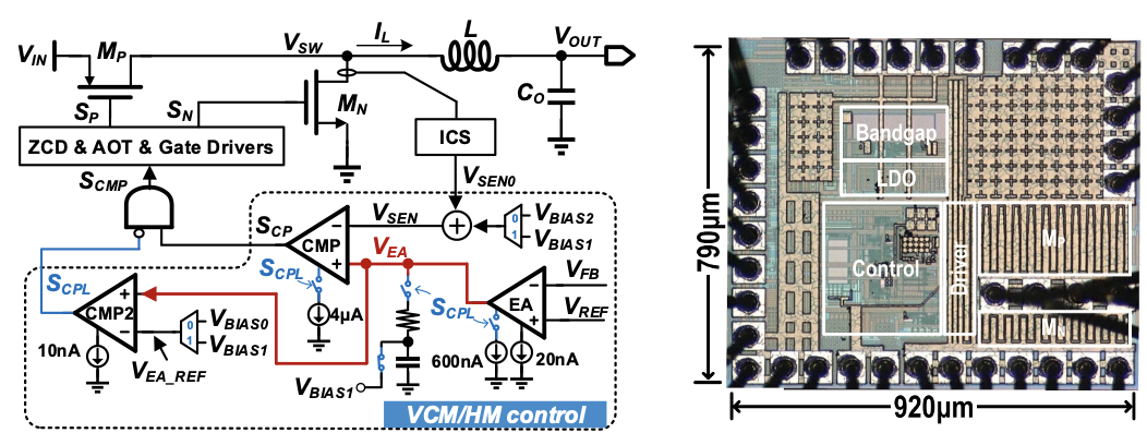 相关设计已在180nm BCD工艺下完成流片验证。芯片测试结果表明,在单节锂电池输出的情况(2.7V-4.2V)下,该转换器仅需约150nA静态电流,实现了在10μA-500mA负载下大于90%的转换效率。在物联网设备对电池供电的苛刻要求下,该转换器可以显著延长电池寿命,在穿戴式电子设备、无线物联网传感器节点等领域中应用前景广阔。