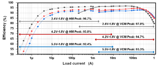 低功耗降压转换器广泛应用于电池供电的物联网及便携式电子设备中,这类设备在睡眠状态下功耗往往低至亚微安级别,而在工作状态下则要求电源具备快速响应能力,并能提供较大的电流(数百毫安)。因此,电源转换器必须在不同负载电流条件下切换不同的控制模式,以实现超宽负载范围内的高效能。