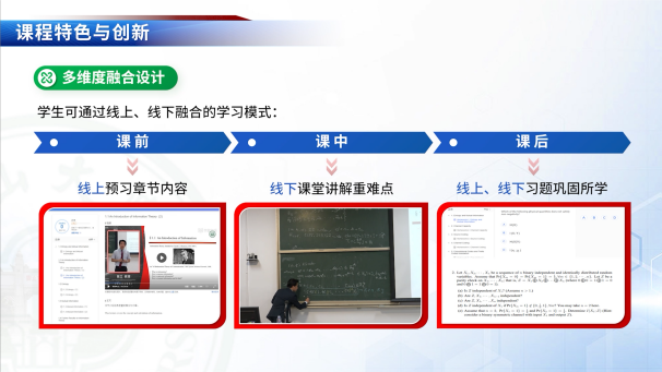 《信息论与编码》课程设有七大章节,第一至第二章节介绍信息论的基本概念和理论模型,包括信息熵、互信息和信道容量等,让学生理解信息论对现代通信系统的理论指导意义;第三章节介绍信源编码的基本原理和方法,包括Shannon-Fano编码和Huffman编码等,让学生了解信息压缩的原理和理论极限,掌握各种主流信源编码技术;第四至七章节介绍信道编码的基本原理和方法,包括香农信道编码定理及证明,循环码、卷积码、Turbo码和Reed-Solomon码等。围绕图1中的课程目标,课程以线上与线下融合的模式,将现代信息技术与线下课堂教学有机融合,显著提升了学生的学习效果。本课程学习难度大,陈立教授通过教学创新,利用自编讲义对知识进行系统性建构,将经典理论与前沿技术进行深度融合,帮助学生更好地理解和掌握课程知识。学生不仅可以在课堂上获得传统的互动式教学,还可利用现代信息技术在多媒体环境中进行丰富的课外学习。例如,学生可以利用线上教学视频与课程讲义提前学习基础知识,通过课堂讲解和板书加深理解,并进一步在课后利用线上习题加以巩固,实现良好的学习效果,如图2所示。图3展现了杏吧视频 的《信息论与编码》课堂。